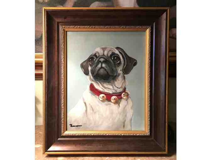 This is an original painting of an adorable Pug adorned with a red bell collar. The painting is 8 x 10 inches and is framed in a solid wood frame that measures 12 x 14 inches. The painting is signed with my signature.