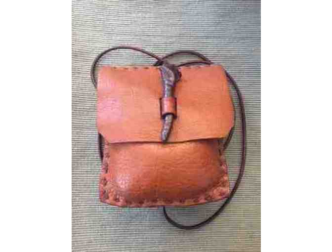 You are bidding on a hand crafted, hand sewn leather bag by Vernell Jordan, Unique Designs in Leather. The bag is 5 1/2" x 6" with a sculpted leather toggle closure. The slender strap is 50 - 58".