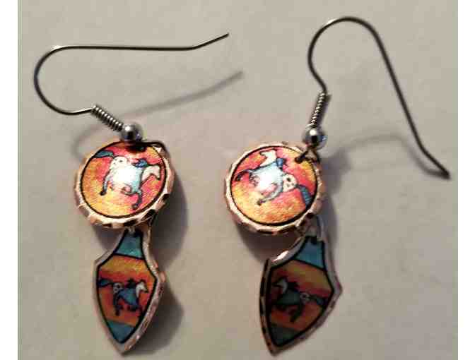 Artist Lynn Bean is renowned for capturing the soul of the horse in pretty, watercolor hues. These dramatic earrings feature a horse running on both the shield and arrow. Feather-light in copper with diamond-cut trim. Hypo-allergenic surgical steel French hooks.