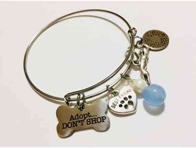 Adjustable Silver Plated Bangle with Sterling Silver Laser Cut "Adopt" Charm, Best Friend, Greyhound and Aquamarine with Freshwater Pearl to match NMDR's colors