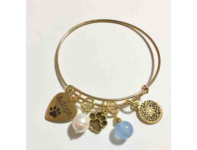 Adjustable Brass Base Gold Plated Bangle with Adopt, Paw and Circles of Colors Stainless Steel Laser Cuts, Aquamarine Gemstone and Freshwater Pearl.