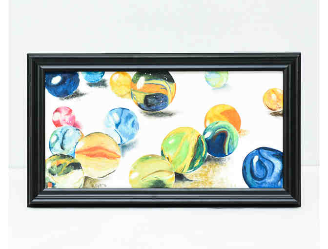 This vivid painting of marbles adds just the right amount of color to any room. Painting is oil on canvas, 22"x12", framed but no mounting hardware attached.