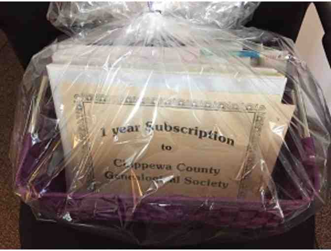Donated by Darlene Hebert and the Chippewa County Genealogy Society, this kit includes a one year membership to the Chippewa County Genealogy Society plus a form to register names to be researched; Family Tree Magazine; a photo pen and pencil to fill in the forms; four binders with 20+ genealogy forms in each binder (color coded for family member), a current CC Genealogy Society newsletter, and two Chippewa County Historical Society Tour Passes all set in an attractive tote.
