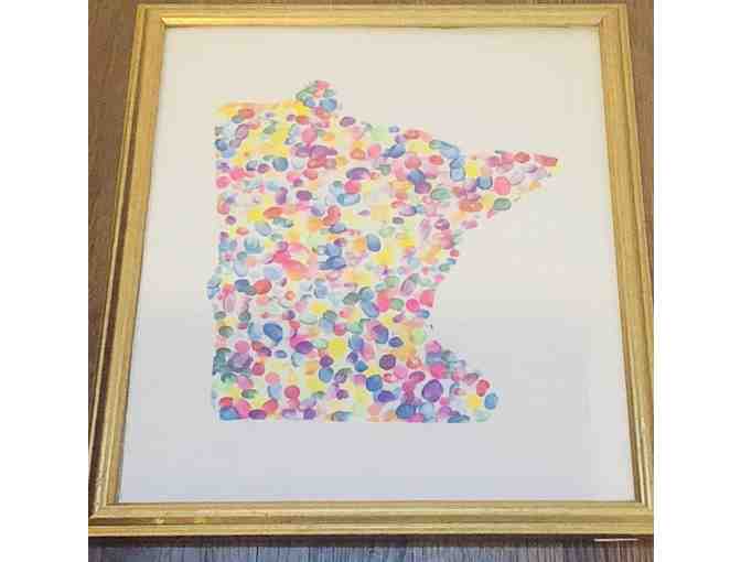 Each student is represented in a color of their choosing, showing their individual uniqueness through their fingerprints. This piece of art shows how as individuals they have come together to create and represent the state they all share, Minnesota.