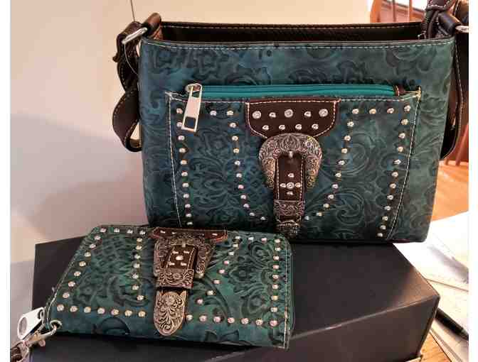 You are bid purseding on an attractive matching crossbody handbag and wristlet. The items are a western style in a teal pattern with buckle decoration. The handbag has two external zippered pockets. Inside is a zippered pocket on one side and an open divided pocket on the other side.