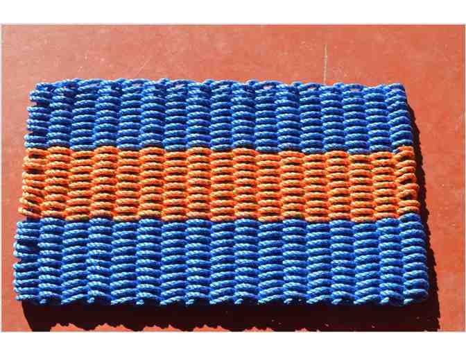 Handmade rope mat. Handmade on the Midcoast of Maine. Color is a pretty orange striped with blue. This mat is roughly 18x30 inches. It can be hosed off to clean. Can be used outdoors. This mat is made from new clean rope and will last a long time.