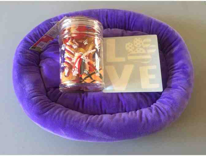 Small purple blue dog bed; Animal Planet toys assortment in container; USA paw print "LOVE" car decal.