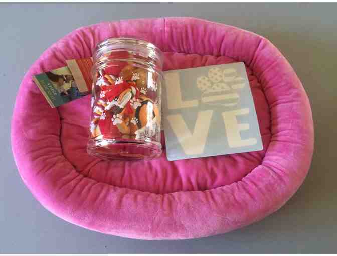 Small pink blue dog bed; Animal Planet toys assortment in container; USA paw print "LOVE" car decal.