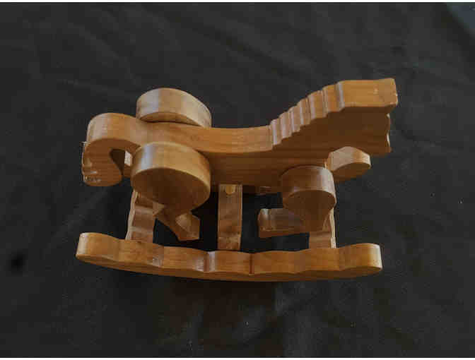 This auction item is a delightful 7.25" x 6" x 3.25" three-dimensional moveable wooden horse that creates a "clip clop" sound when it is rocked back and forth.