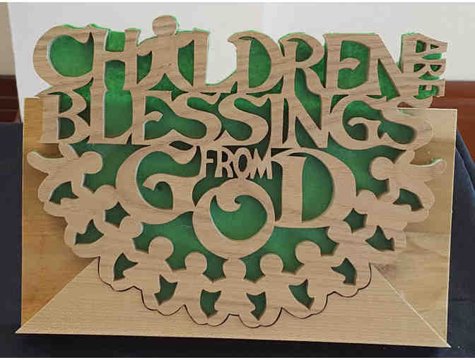 This auction item is a carved 8" x 10.5" wooden plaque that says "Children are Blessings from God" and rests on its own wooden stand.
