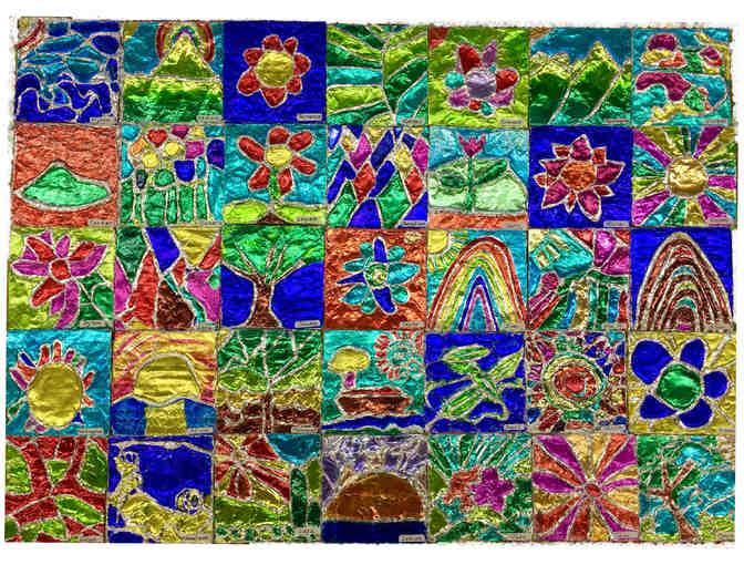 The result of this yarn and foil relief project by second graders is artwork that is reminiscent of both stained glass and cloisonné. The yarn provides 3D line designs while the colored foil provides an overall sheen.