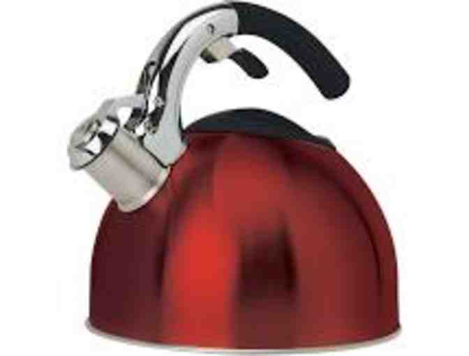 The Primula Soft Grip Tea Kettle is constructed of stainless steel with an encapsulated bottom. It's stay cool soft grip handle and flip up spout allows for safe handling, and a classic whistle sounds when water is boiling. The removable lid allows for easy cleaning and filling of the 3-quart capacity kettle. Available in a deep red stainless steel, the Primula Liberty Soft Grip Tea Kettle is a beautiful edition to the contemporary kitchen.