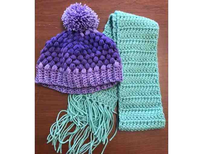 Kids handmade crocheted hat and scarf made by local artist Donna Kerr