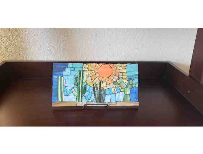 Stained glass mosaic art with a cactus design. Measures 6x12x1/4 inches. Made of stained glass, Weldbond glue, Skeewbacker board and non-sanded grout. Comes with stand that is shown in photo. The edges are unfinished, just grouted. This piece is for indoor use only as I used non-sanded grout. Skeewbacker is a strong and lightweight backer board; this piece only weighs a few pounds.