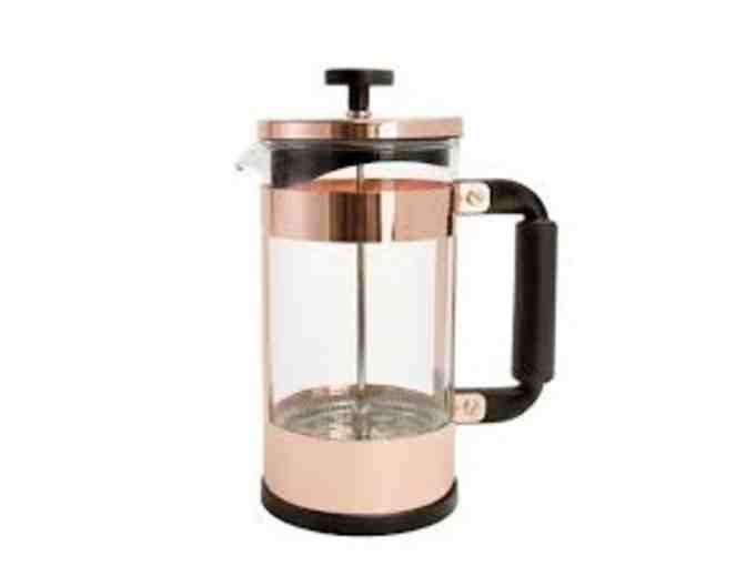Nothing beats Primula's 8 Cup Copper finish coffee press when it comes to delivering delicious, perfectly brewed hot coffee. Made with high quality borosilicate glass, complimented with a copper finish lid and accents. Primulas' coffee press has a heat-resistant knob and plunger that securely fits atop the lid. The carefully designed fitted lid and angled spout allows for clean, even pours. The coffee press includes an advanced filter plunger that provides you with superior brewing capabilities regarding your coffee strength. Includes a filter spiral plate, a fine stainless steel mesh filter with cross plate, and easy to use plunger. All parts are designed to make sure your coffee grounds are kept into the beaker and out of your cup. Dishwasher safe.