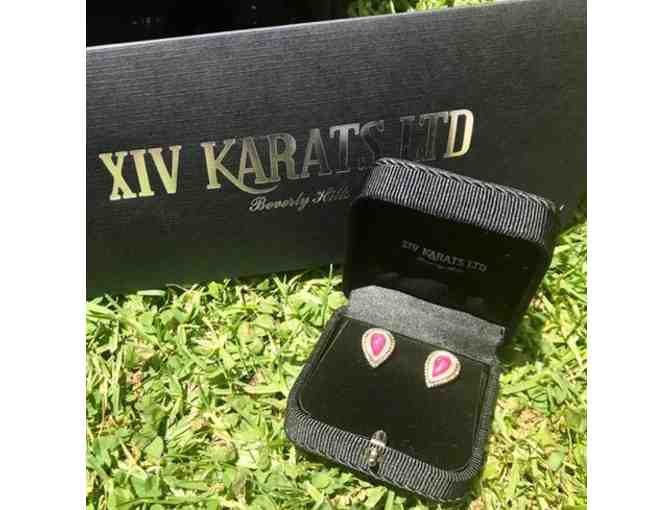 Win these beautiful lady's sterling silver and gold diamond earrings containing diamonds and two pear-shaped ruby cabochons.