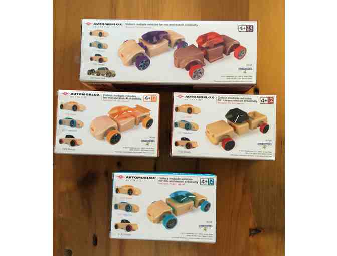 Sturdy wooden cars (real wood) by Automoblox, no special assembly required. Great for mixing and matching. Children ages 4+. Each car measures 4 1/2" by 2". Donated by Chris Byrne and TTPM.com toys.