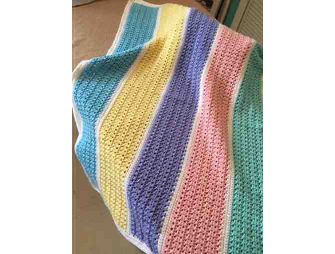 This multi colored pastel baby blanket would fit in any decor! Perfect for a new baby or a new four legged addition! Machine washable.