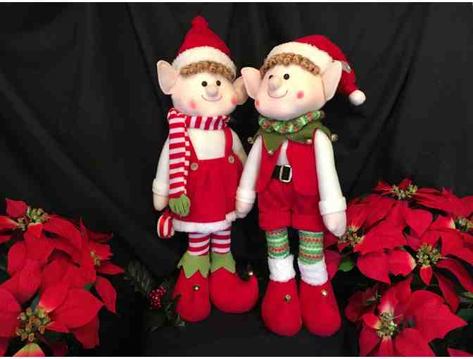 These holiday free standing elves measure 23" high and are 100% polyester.