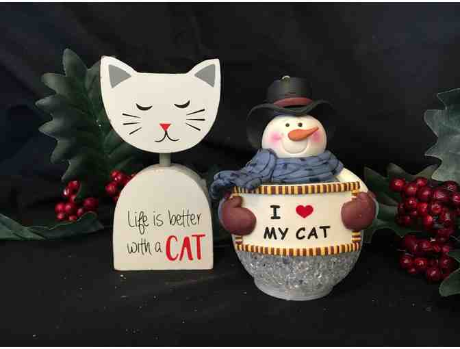 For the cat lover's . . . a 4.5" high wooden cat figurines and a resin Love my Cat lighted ornatment, also 4.5" high.
