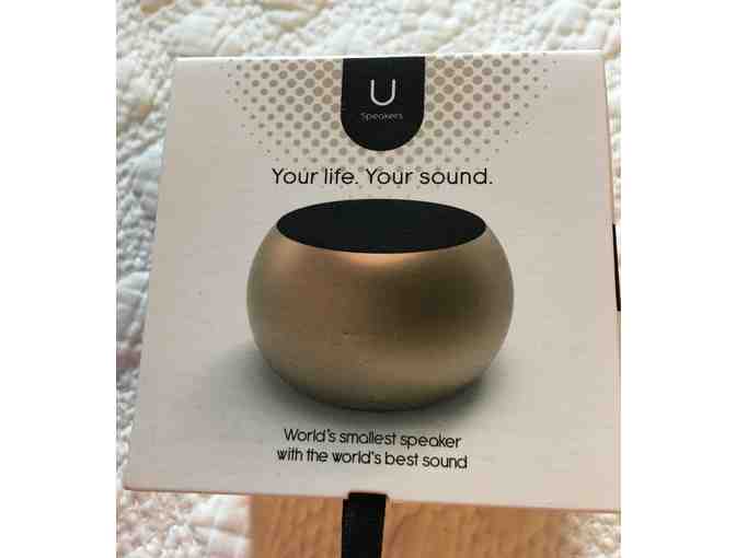 The world's smallest speaker, from U Speakers, stands 1.75" x 1.3", but packs a punch. Carry it in your bag, amplify a room. For ages 12 and up. Donated by Chris Byrne and TTPM.com.