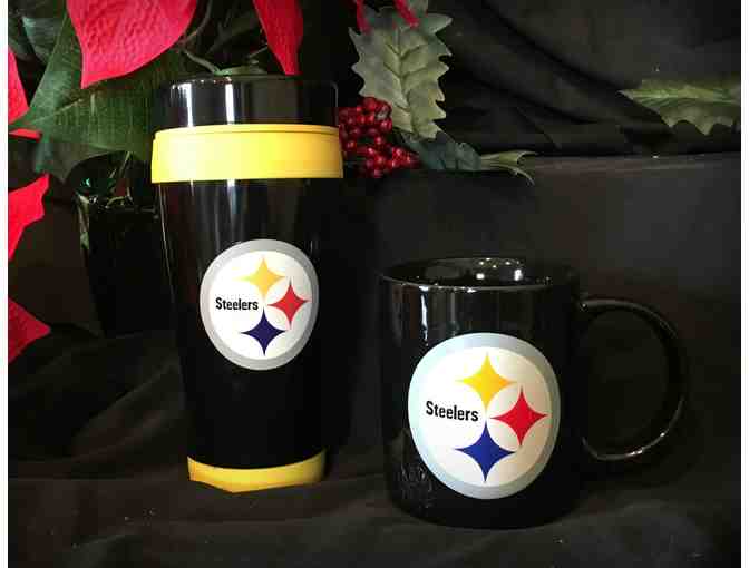Officially licensed Steelers Travel Mug and Ceramic Mug, perfect for at-home or on the go.