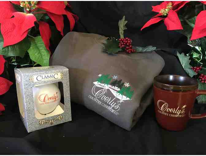 Glidan pewter embroidered sweatshirt, L; Overly's commemorative ornament and ceramic mug AND a bonus Vehicle Guest Admission for the 2018 Season of Overly's Country Christmas®.