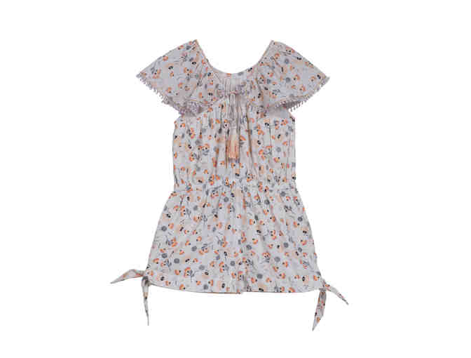 Velveteen Corrie Playsuit features flutter sleeves with small pom poms at the sleeves, an elasticated waistband and a tassel tie closure at back.