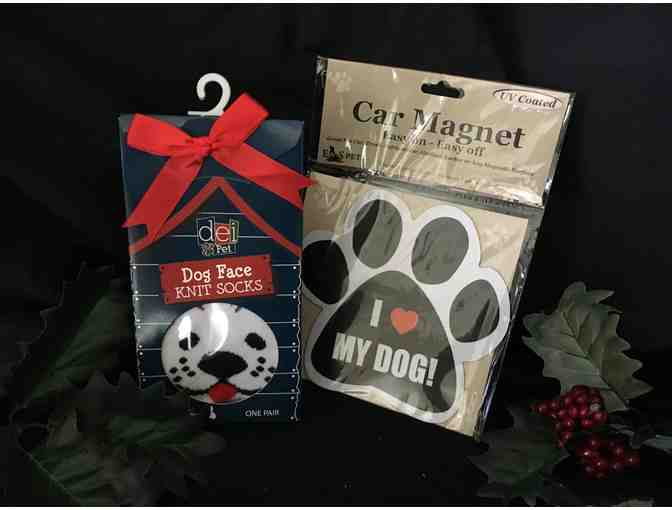 For the dog lover . . . dog face knit socks and car magnet.