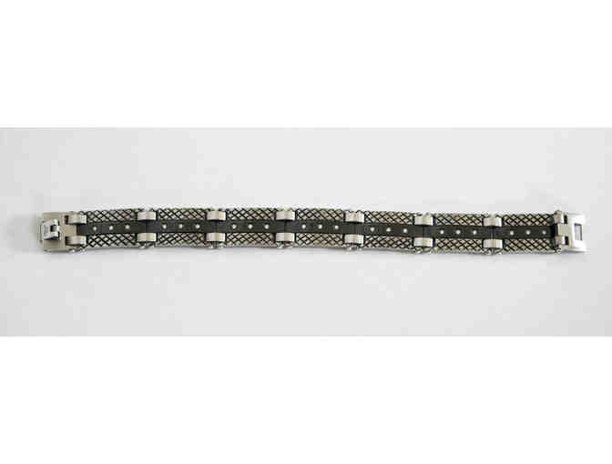 Edgy 9" patterned stainless steel men's bracelet with stones.