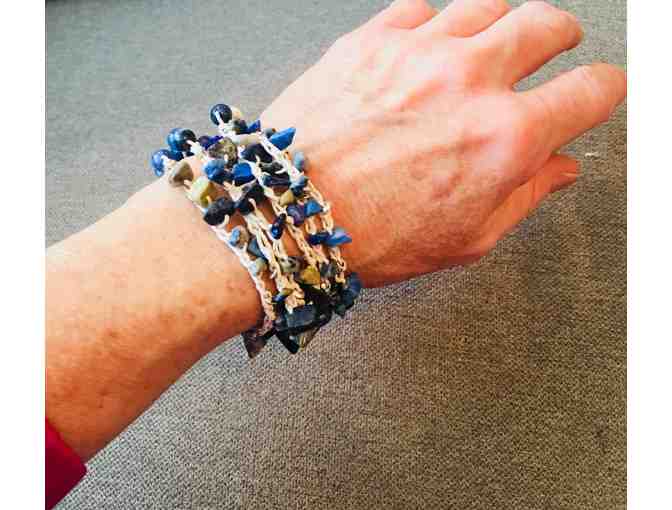 This hand crocheted blue, green and white beaded necklace may be worn as ither a necklace or as a bracelet.