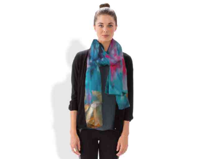 The piece is inspired by a portion of an original painting done by Alamo parent, This iAriel Gold. The original work can be viewed within the website or by clicking on the next photo if available. Each scarf is uniquely designed and custom-printed. It may vary slightly upon receipt.