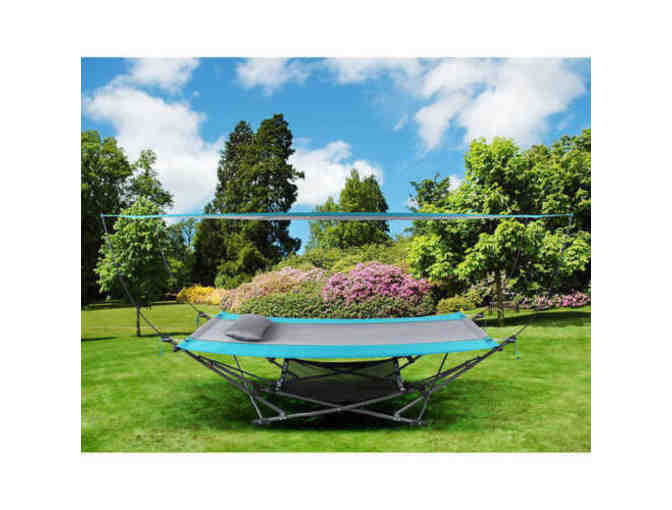 This folding hammock with canopy sets up in minutes, making it ideal for relaxation while camping or outdoor. The collapsible frame makes it easy to transport and stow, comes complete with its own carry bag. Features strong and durable ripstop fabric with mesh accents to increase your comfort and keep you cool. Hammock can be set up with or without the canopy and includes a matching pillow.