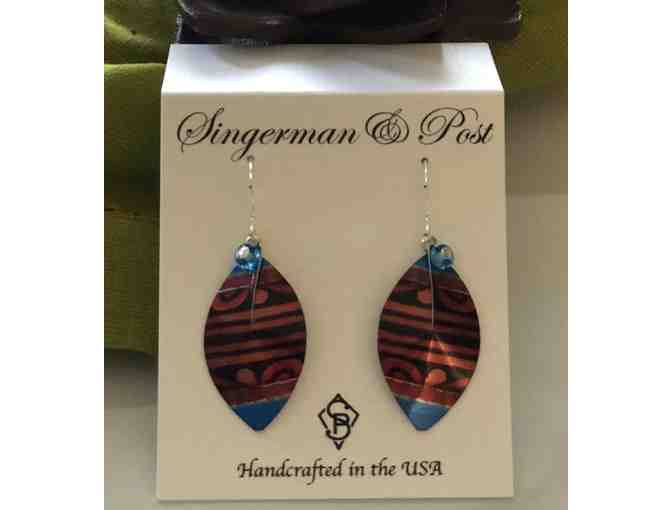 Uniquely colorful lightweight jewelry. The earrings were laminated together using multiple layers of metalized plastics, original artwork designs, and a clear protective overlaminate. Each earring is hand-cut and assembled into sculptural shapes with glass and metal beading. Waterproof/uv resistant and light as a feather. Catch the light.