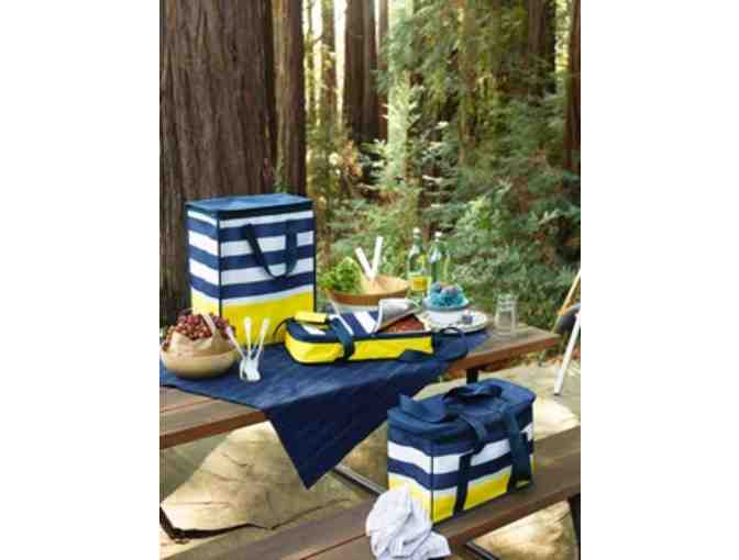 Set includes: Bamboo bowl, cutting board & serving utensils; veggie griller; corn griller; 3-piece thermal hot/cold totes in assorted sizes.
