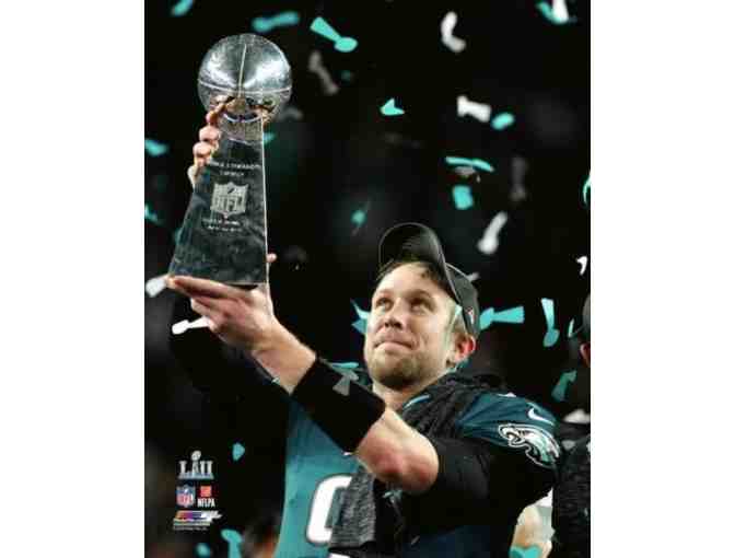This photograph captures the moment when Nick Foles lead the Eagles to a Super Bowl victory against the New England Patriots.