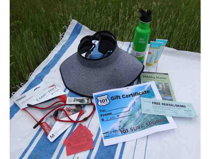 Enjoy the great outdoors with this adventure collection. Includes: $200 gift certificate to 101 Surf Sports for stand up paddle rental; roll-up travel sun hat; sunscreen; Hiking Marin guidebook; Any Mountain demo & rental gift certificate; water bottle; waterproof phone case; 4 passes to Scandia mini golf.