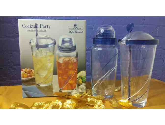 Luigi Bormioli cocktail party mixer and shaker. The mixer and shaker are made of crystal glass. The mixer holds 21 ounces, is approximately 6 3/4 inches tall and has a lid and spoon. The shaker has a screw on top and holds 20 1/4 ounces, the glass measures 7 inches tall and has a screw on shaker top. Made in Italy.
