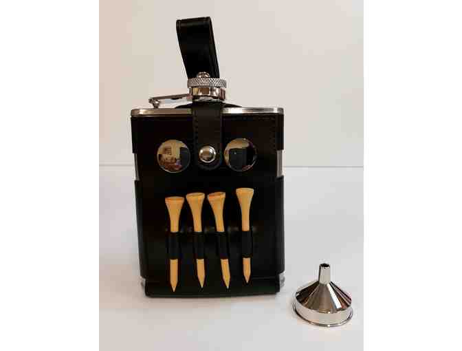 Get ready to tee up with this black genuine leather wrapped hip flask. For the indulgent golfer, this stainless steel flask features a belt loop for hands free action, tees, markers and pitch: everything you need for the perfect afternoon on the course. Flask holds 8 oz. of your favorite liquor. High grade 18/8 stainless steel materials used.