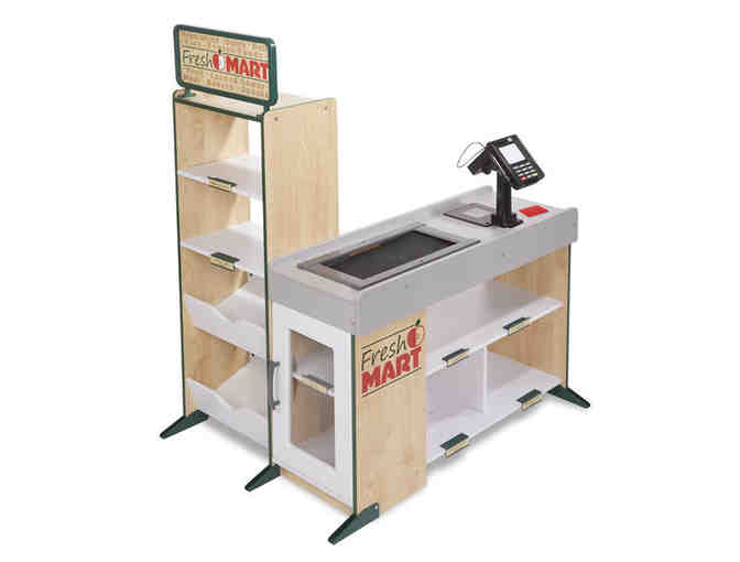Shopping and playful purchasing is exciting at the sturdy wooden Fresh Mart Grocery Store! The free-standing play space with smooth, curved corners and edges lets customers three and older browse the shelves and pay for purchases on one side, and allows the grocer to ring up items on the other. Realistic features include beeping "scanner," a hand-crank conveyor belt, a card-swiping machine, a keypad/calculator, and cash drawer. Kids are sure to find everything on their shopping list at this friendly neighborhood grocery store!