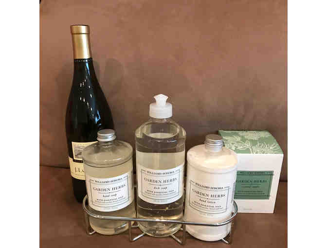 Five-piece kitchen countertop set includes a chrome-finished caddy that holds Garden Herb hand soap, dish soap and hand lotion as well as a scented candle, and paired with a bottle of J. Lohr wine.