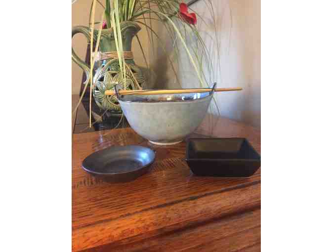 Ceramic Noodle bowl with chapsticks and a set of ceramic dip bowls.