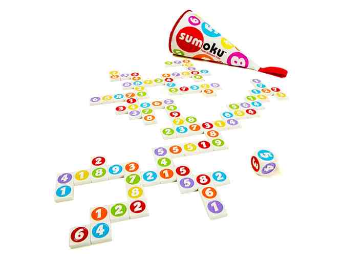 Sumoku is a unique crossword-style game with numbers. Players add up their numbered tiles to a multiple of the number on the die. Scores grow with every connected row and column. With 5 game variations and endless challenges, the fun quickly adds up with Sumoku! Includes 96 numbered tiles, 1 die, and a canvas zippered pouch.