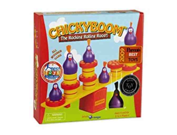 Down on the farm, the chickens are as happy as can be on their perch. But when one stirs, everything starts to wobble! Get the chickens, wagon wheels and hay bales off the rocking perch without making it topple. The pieces in this counting game have different weights and point values. The player with the highest score wins the game. A game of balance, counting and laughs where the roost goes Chickyboom!