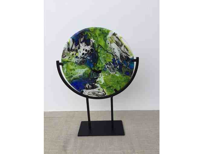 Glass is cut into small strips and strategically arranged on to a metal screen that has been raised approximately 6 inches above the shelf of the kiln. The kiln is then heated to 1675 degrees to allow the glass to melt slowly through the screen and on to the shelf below. It is this collaboration, with the process swirling and melding the artist’s selected glass palette, that creates a truly one of a kind piece. ã
