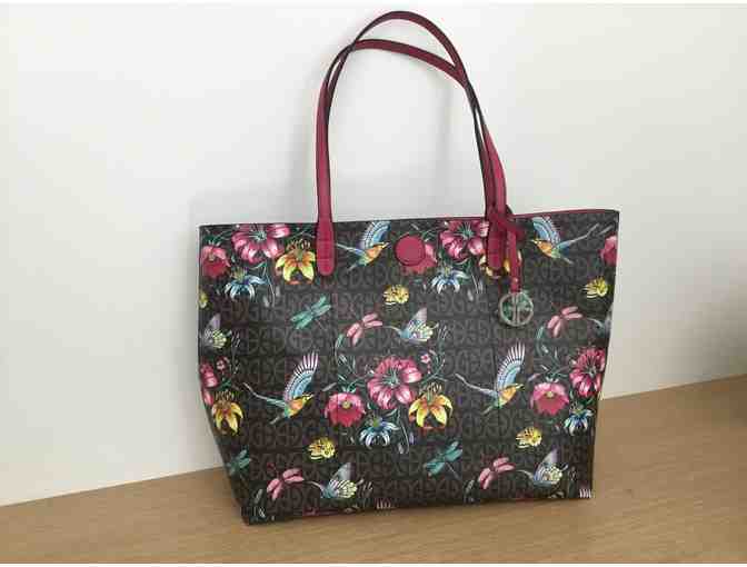 Win this roomy Giani Bernini bag, which features organizer and smartphone pockets, magnetic closure, and a matching zippered cosmetics bag. It is large enough to fit a laptop, measuring approximately 18" x 12 1/2", with a handle drop of approximately 9".