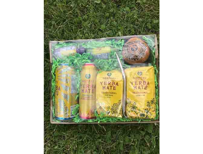 Guayaki Yerba Mate : Gift Basket including One 8 oz. bag of traditional loose leaf tea, One box traditional yerba mate tea bags, One can bluphoria, One can sparking cranberry pomegranate, One fair trade gourd and bombilla, Three yerba mate shots.