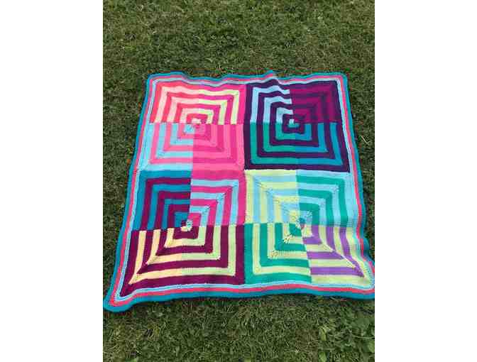 Beautiful wool hand knit blanket by Summerfield's own Peaches Davenport. Approximately 3 ft. by 3ft. in size.