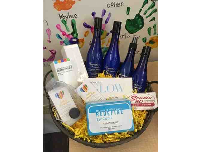 A basket filled with Keyano Moisturizing Shampoo and Conditioner, Protein Spray, and Leave-In Treatment Styling Aid and all your Rodan+Fields Skincare favorites(Eye Cloths, Active Hydration Serum, Microdermabrasion Paste and Give it a Glow Facial)!