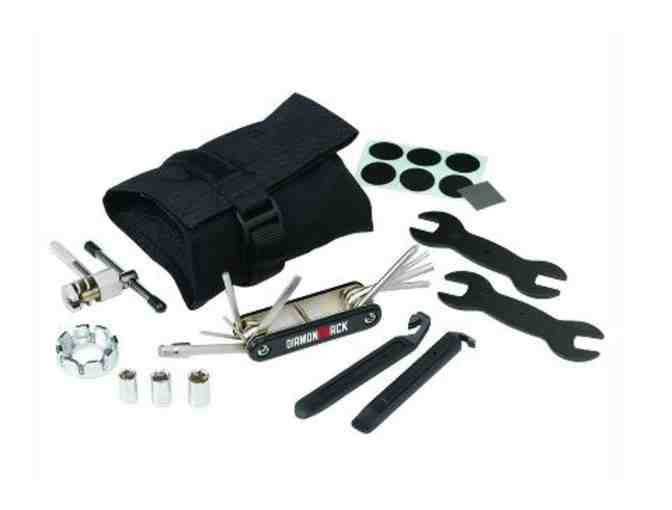 Economical starter or take-along bike tools. Includes; universal spoke wrench, chain tool, tire levers, glueless patch kit, folding multi-tool with 2-8mm hex wrenches, 8, 9, 10mm box wrench socket attachments, 13/14mm concave wrench and 15/16mm cone wrench in a convenient roll up pouch.